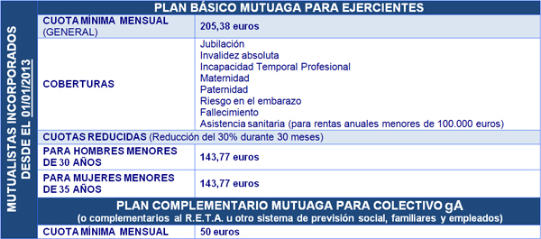 Los Gestores Administrativos que quieran ejercer la profesión podrán optar por el sistema de previsión social Plan Básico MUTUAGA (alternativo al sistema público pero más económico que el R.E.T.A.), desde una cuota mensual de 205,38 euros. En el caso de hombres jóvenes menores de 30 años y mujeres menores de 35 años la cuota mutual será de tan solo 143,77 euros al mes.