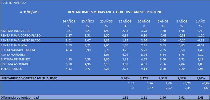 Así se desprende tras analizar los datos de rentabilidad de los planes de pensiones publicados por INVERCO a 31/03/2019 y los datos de la cartera de inversiones de la Mutualidad, cuya comparativa arroja siempre valores positivos a favor de la Mutualidad.